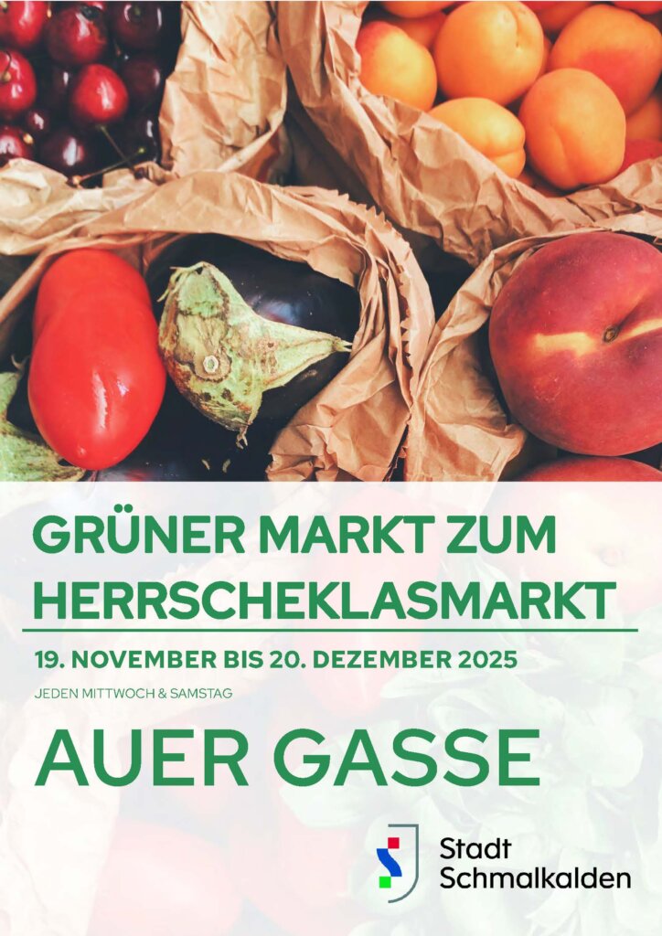 Der Grüne Markt bleibt während des Herrscheklasmarktes wie gewohnt mittwochs und samstags bestehen. Ab dem 19.11.2025 befinden sich die Wochenmarkt-Händler in der Auer Gasse, direkt angrenzend an den Herrscheklasmarkt.